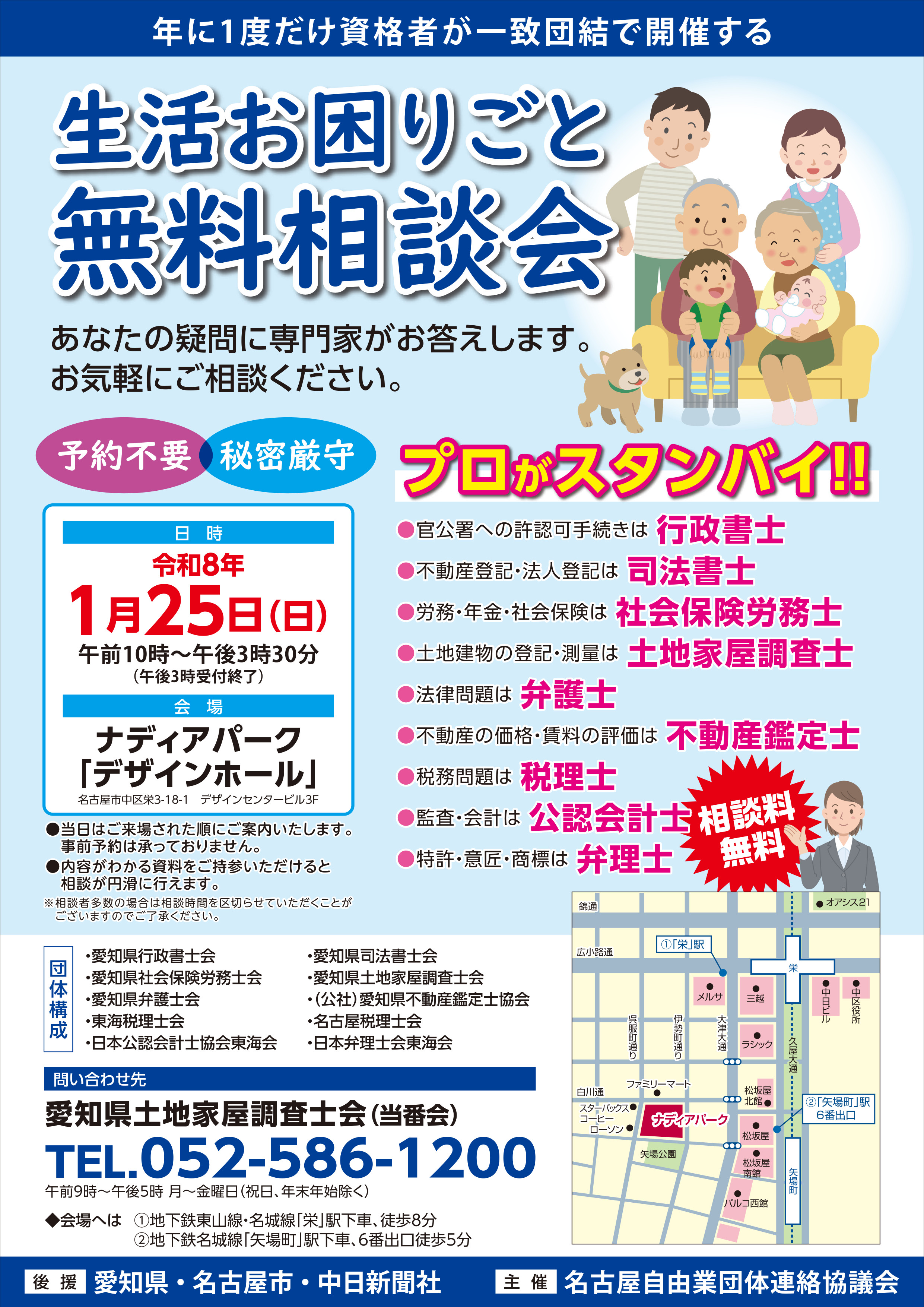 名古屋自由業団体連絡協議会では、1983年から毎年、広く一般の方々を対象に、参加9業種10団体の専門家による、法律・税金・監査・会計・土地家屋の測量・登記・不動産・賃料の鑑定・年金・労務・各種営業許可申請・特許・意匠・商標等についての「無料相談会」を開催しております。